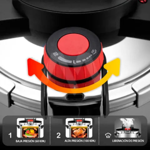 La Olla TurboChef cuenta con un innovador sistema de válvulas de escape de 3 marchas, diseñado para ofrecerte un control absoluto durante la cocción:Micropresión (Marcha 1): Perfecta para cocciones suaves y delicadas, conservando el sabor natural de los alimentos.